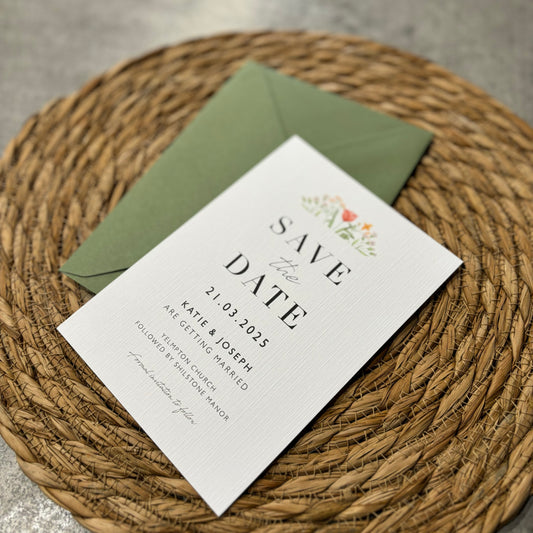 The Sophie - Save the date luxury Ribbon Wedding & Envelope | Simple stationery | Personalised invitation | Sage green, Pink, Dusky Blue, Burnt Orange