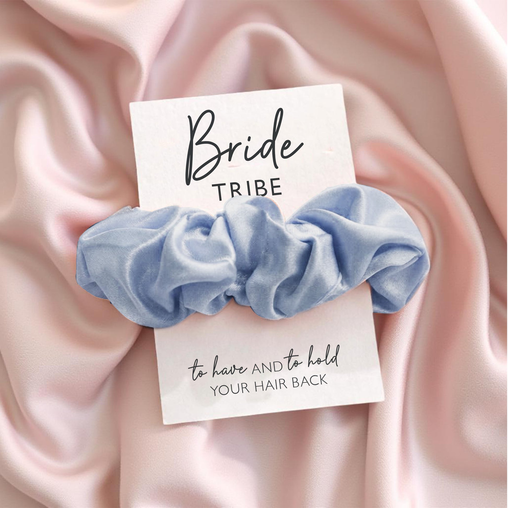Personalised blue hair scrunchie hen party favours – available in Bride Tribe, Bride Squad and the full bridal party set. A stylish and practical gift that makes the perfect addition to any hen do, bachelorette or bridal shower.