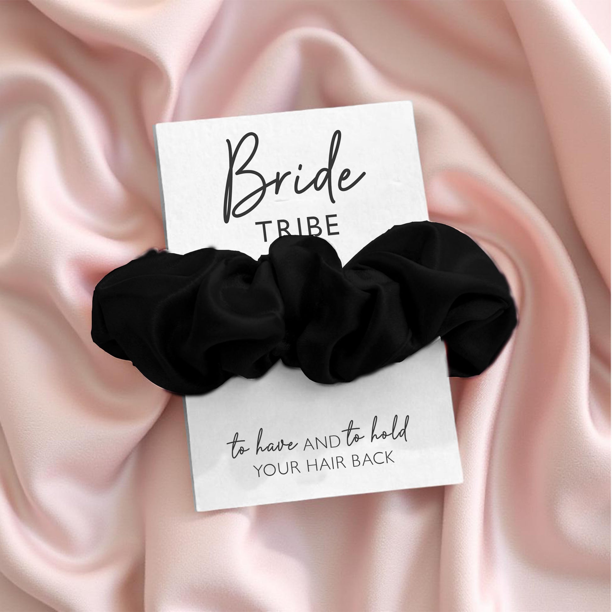 Personalised black hair scrunchie hen party favours – available in Bride Tribe, Bride Squad and the full bridal party set. A stylish and practical gift that makes the perfect addition to any hen do, bachelorette or bridal shower.