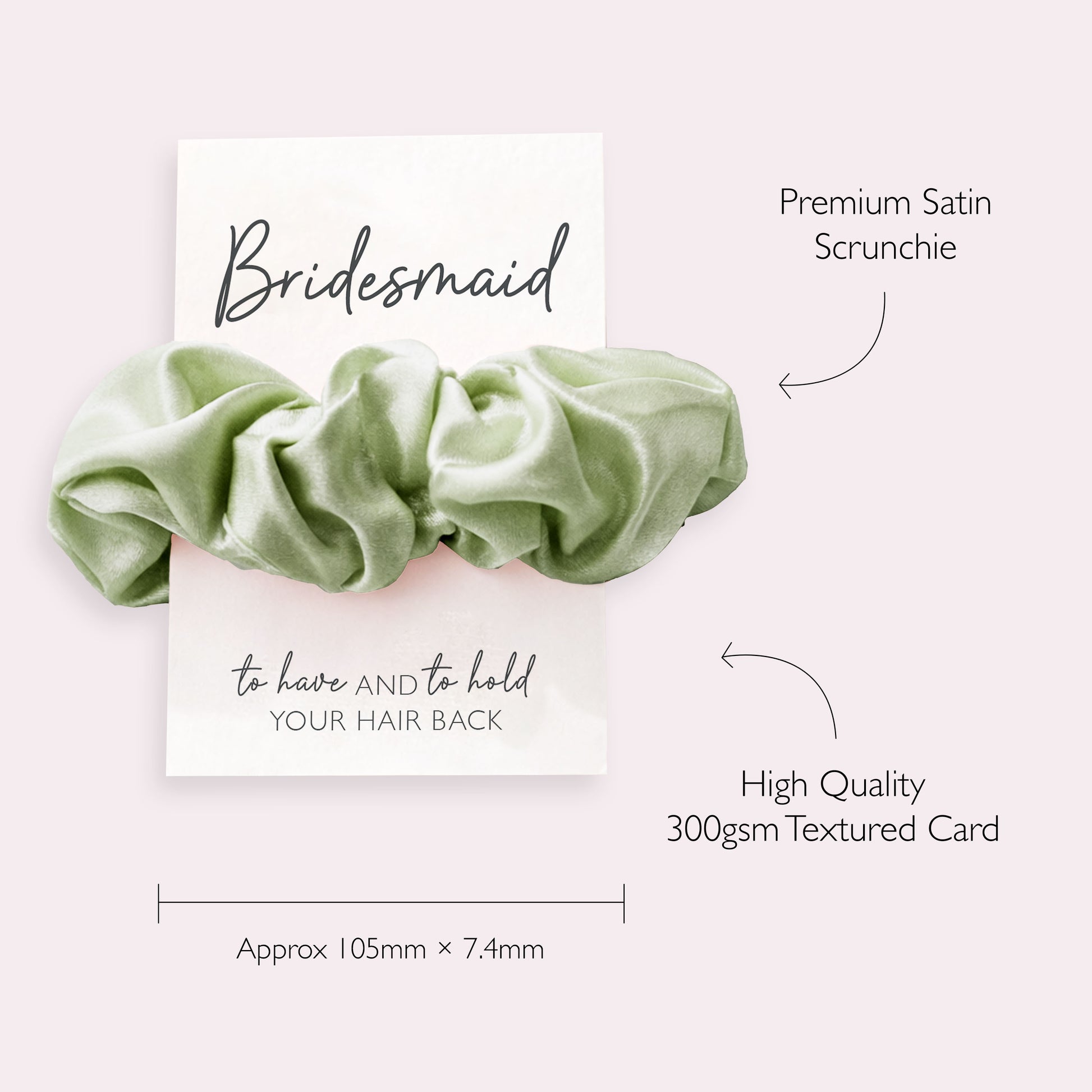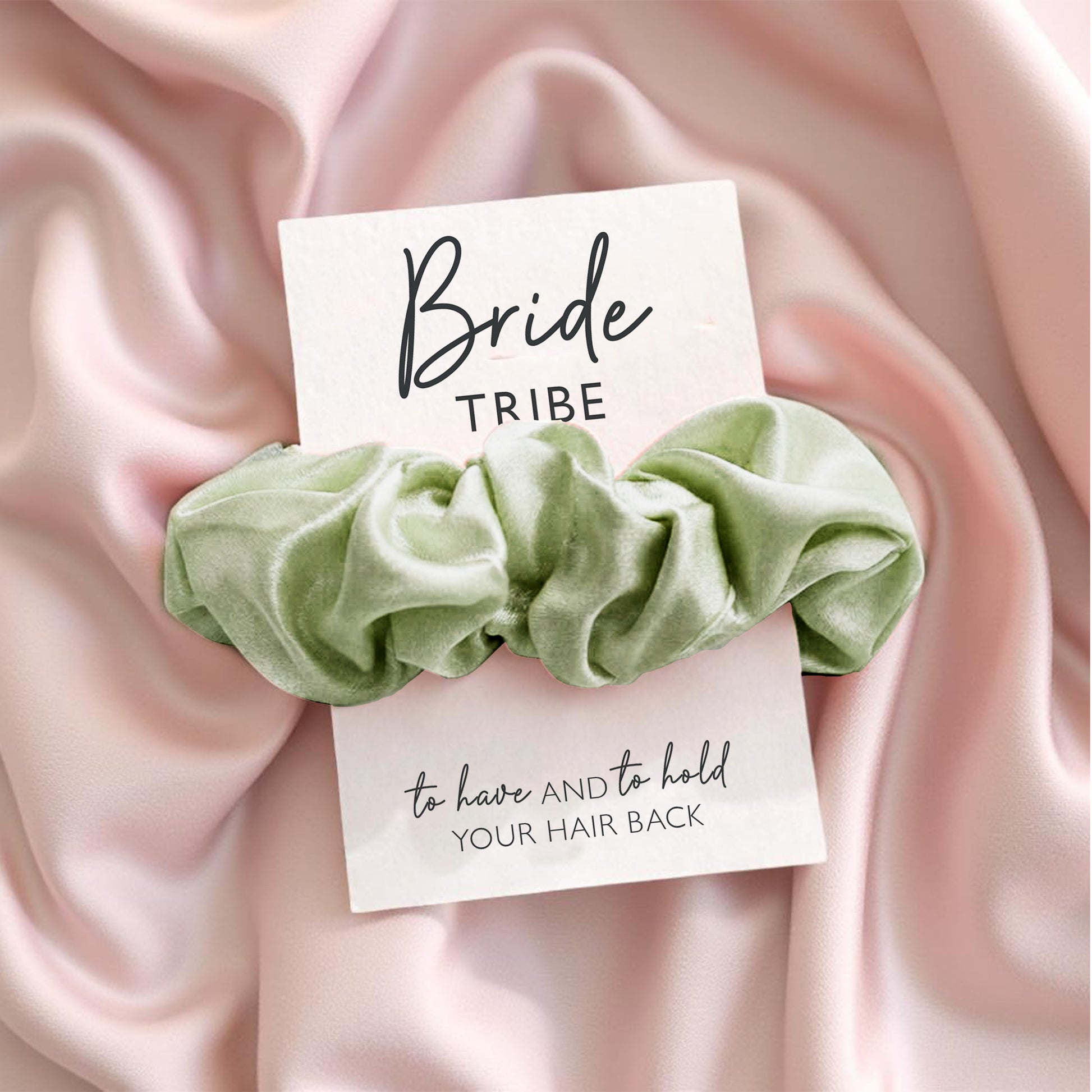 Personalised sage green hair scrunchie hen party favours – available in Bride Tribe, Bride Squad and the full bridal party set. A stylish and practical gift that makes the perfect addition to any hen do, bachelorette or bridal shower.