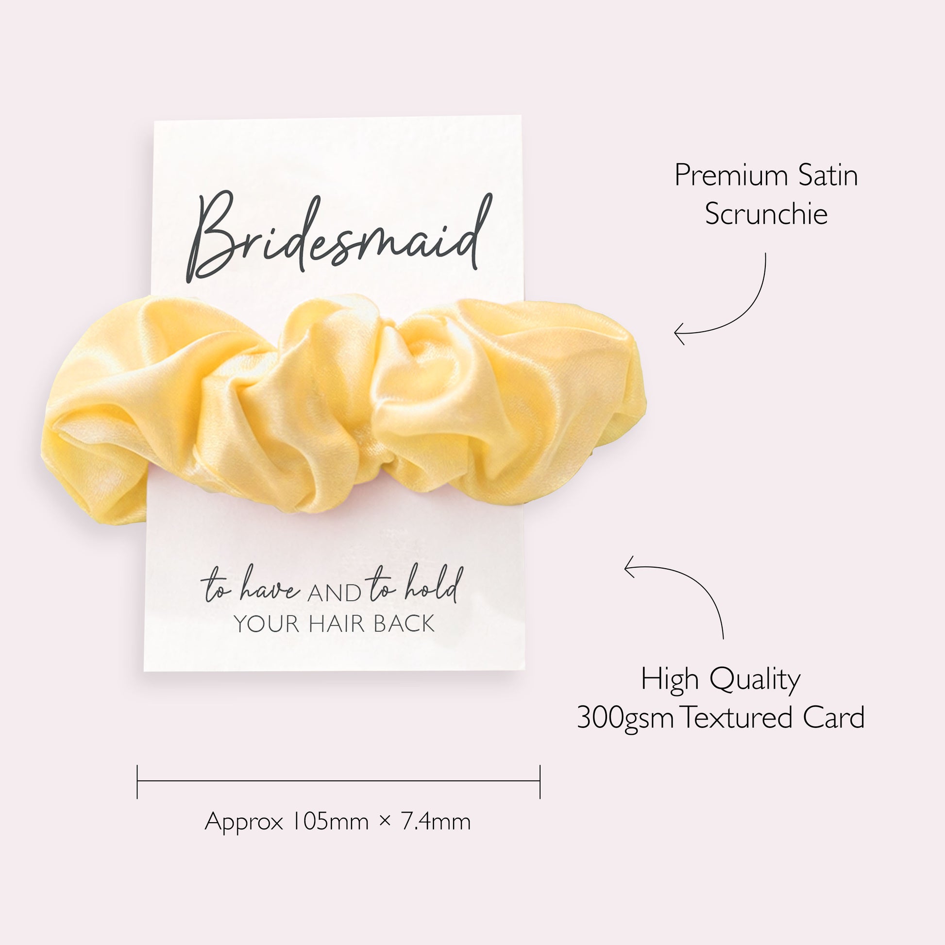 Personalised yellow hair scrunchie hen party favours – available in Bride Tribe, Bride Squad and the full bridal party set. A stylish and practical gift that makes the perfect addition to any hen do, bachelorette or bridal shower.