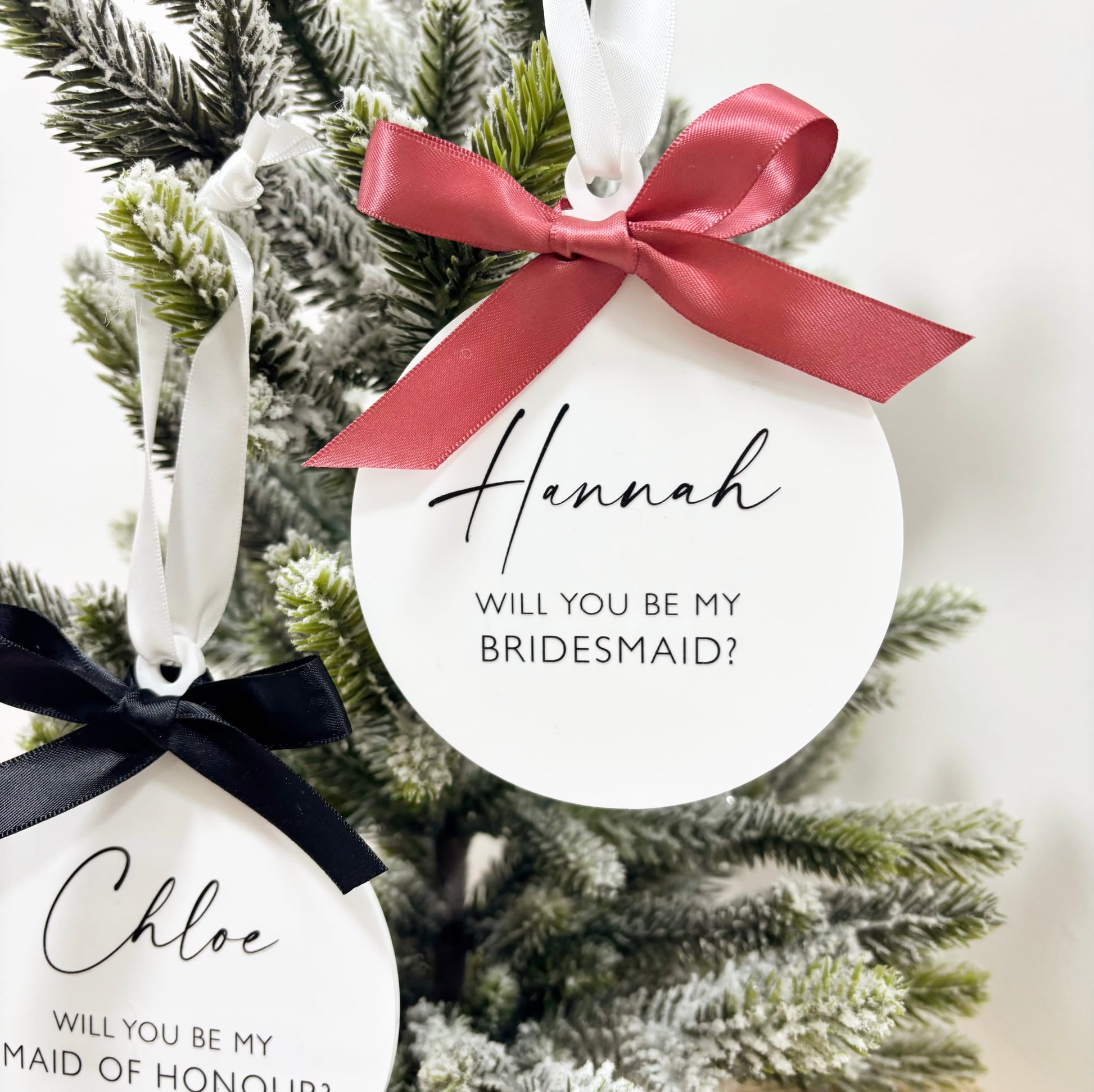 Personalised Bridesmaid Proposal Bauble | White Acrylic Wedding Keepsake Gift | Christmas Wedding Gift
