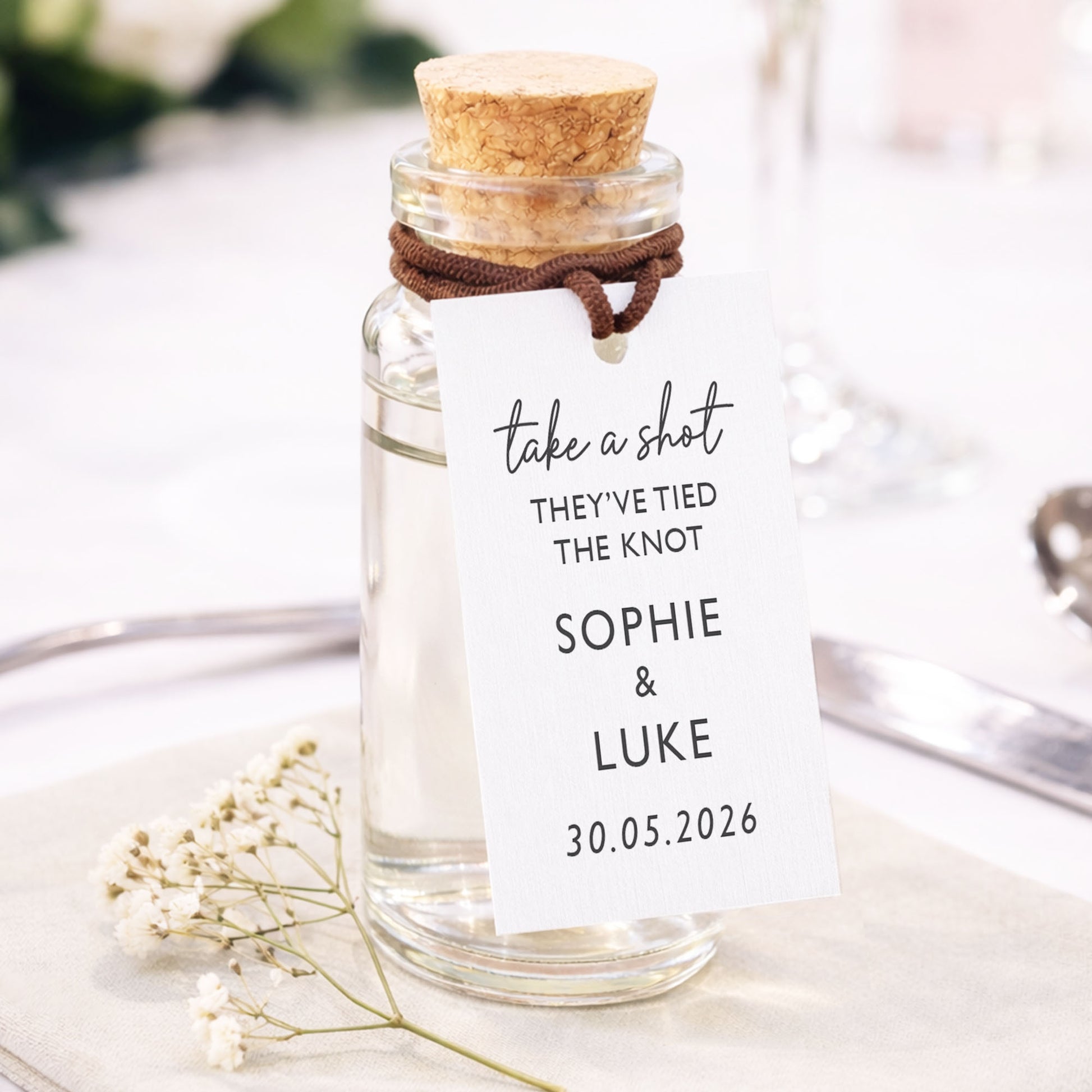 Celebrate your special day with our Tied the Knot Wedding Favours – Take A Shot Favor Wedding Tags & Bottle - ready assembled, the perfect addition to any wedding, creating a beautifully personalised wedding keepsake your guests will treasure long after you’ve tied the knot.