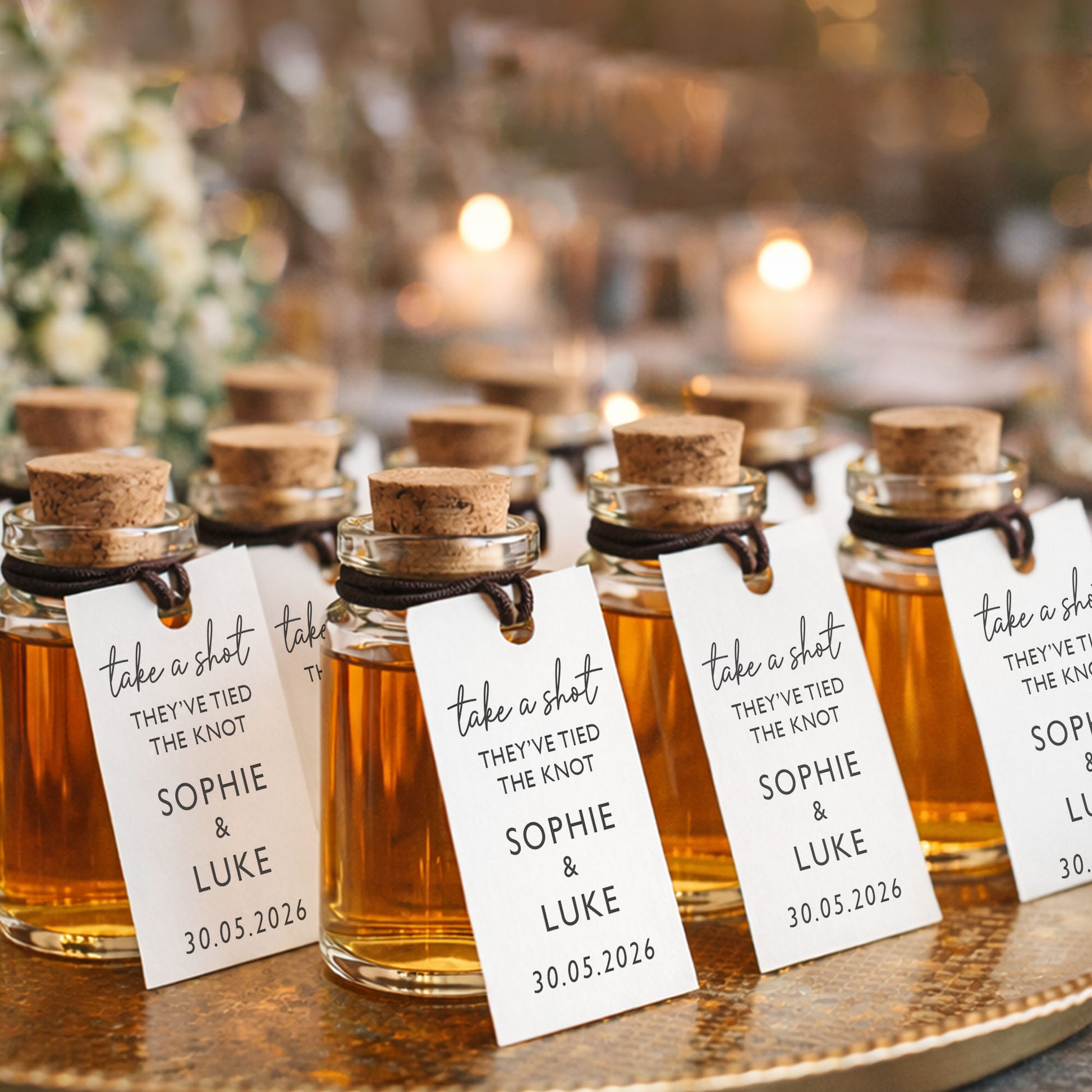Personalised Shot Bottle Wedding Favours with Tag – Rustic Favours, Take a Shot Wedding Idea, Shot Bottle Labels, Stickers, Tags, Wedding