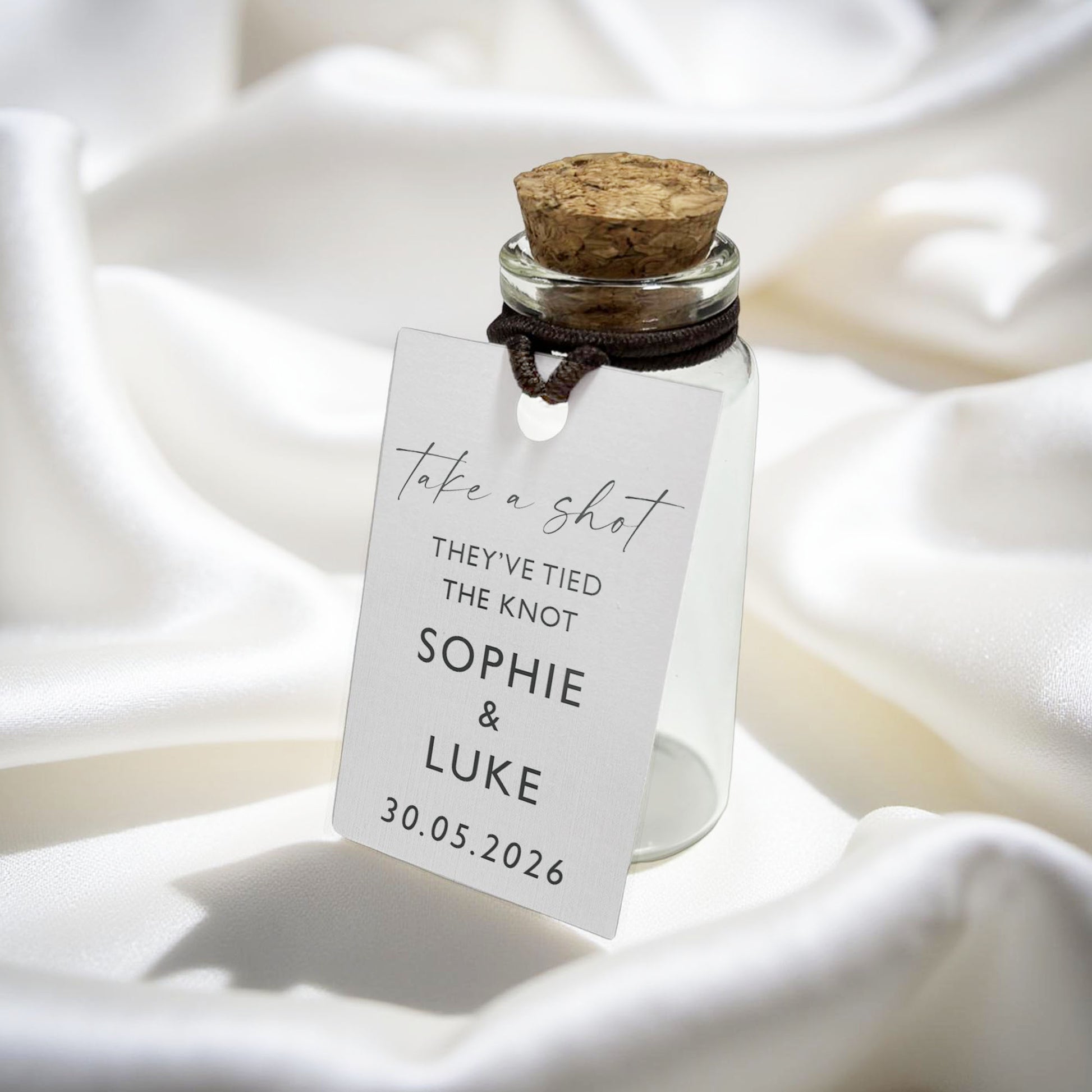 Personalised Wedding Shot Bottle Favours with Tag | Take-a-shot Favours | They've tied the knot | Wedding Favours | Best Seller